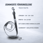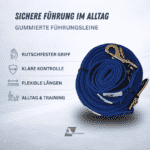 Die gummierte Führungsleine wurde für Hundebesitzer entwickelt, die bei Spaziergängen, Trainingseinheiten oder im täglichen Miteinander Wert auf sicheren Halt, Kontrolle und ein angenehmes Handling legen, unabhängig vom Wetter oder der Situation.