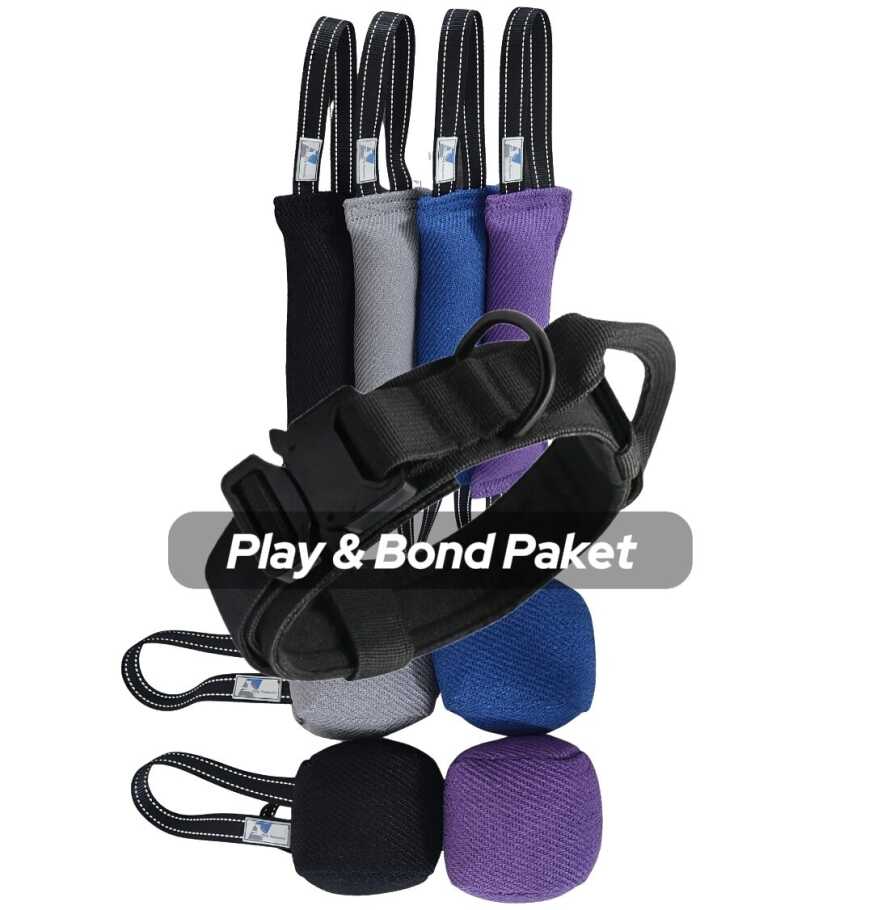 Das Starter Kit enthält ein Beißkissen und eine Führleine für den Einstieg ins strukturierte Training. Das Play & Bond Paket setzt auf Spiel und Abwechslung im Alltag, mit Halsband statt Leine und Cube statt Kissen.